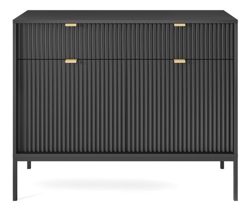Wyposażona w solidną konstrukcję z aluminium, metalu oraz meblowej płyty, komoda zapewnia nie tylko atrakcyjny wygląd, ale również długowieczność. Elegancki, czarny kolor w połączeniu z metalowymi uchwytami sprawia, że stanowi ona efektowny akcent w każdym pomieszczeniu. Jej pionowo frezowane fronty przyciągają wzrok i nadają meblowi nowoczesny charakter, który z łatwością wpasuje się zarówno w aranżacje glamour, jak i industrialne.