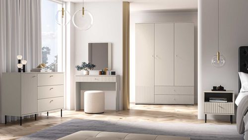 nowoczesna komoda do salonu posiada także jednodrzwiową szafkę, wewnątrz której znajduje się półka. Układ ten pozwala na przechowywanie ubrań, czy innych przedmiotów, w taki sposób, by mieć je uporządkowane. Komoda z szufladami i szafką to idealny wybór do przestrzeni salonu lub do sypialni.