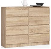Prezentowany mebel z pewnością doskonale sprawdzi się w salonie, jak również sypialni, jadalni lub domowym gabinecie. Komoda K140 wyposażona w osiem szuflad okaże się także praktycznym rozwiązaniem w każdym wnętrzu biurowym. Cechami charakterystycznymi tej propozycji są przede wszystkim modny kolor dąb sonoma, funkcjonalność oraz solidne wykonanie. Mebel wykonany z płyty laminowanej o grubości 16 milimetrów, wykazującej odporność na ścieranie, na pewno przypadnie do gustu osobom lubiące praktycznie zaaranżowane, nowoczesne przestrzenie. Duża komoda w konkurencyjnej cenie powinna sprostać wymaganiom wszystkich klientów ceniących sobie dobry stosunek niskiej ceny do wysokiej jakości wybieranych przez siebie produktów. Mebel jest łatwy w czyszczeniu i świetnie łączy się z wszelkimi dodatkami.