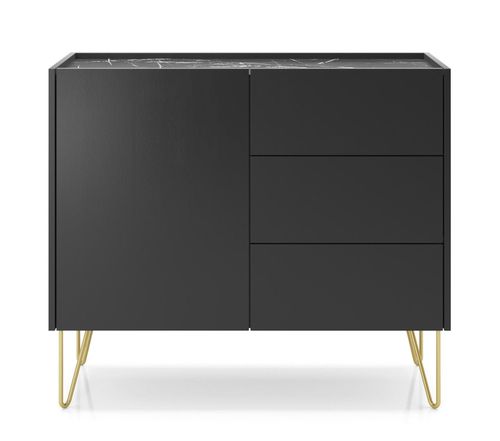 Czarna komoda z blatem imitującym czarny marmur usadowiona jest na wysokich, metalowych nogach w kolorze złotym. Komoda wyposażona jest w trzy głębokie szuflady oraz szafkę z dwoma półkami. Komoda w stylu glamour będzie pasować do nowoczesnego i modnego wnętrza salonu lub gabinetu.