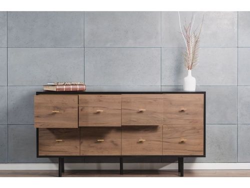Polski produkt wykonany z najwyższej jakości materiałów to gwarancja trwałości i satysfakcji. Korpus mebla stworzony z czarnej płyty meblowej lakierowanej na wysoki połysk wprowadzi do wnętrza nutę luksusu, a eleganckie fronty z płyty meblowej laminowanej w kolorze dąb craft tabacco podkreślą jego wyjątkowość. Osiem praktycznych szuflad pomieści wszystkie Twoje skarby, pomagając utrzymać porządek i organizację w stylowy sposób.