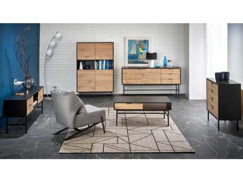 Komoda MURANO KM-1 to mebel niezbędny w każdym mieszkaniu w stylu loft. Komoda wykonana została z płyty MDF okleinowanej w kolorze dąb artisan i czarnym, a nóżki, to stal malowana proszkowo na kolor czarny. Komoda posiada trzy szuflady oraz dwie zamykane szafki. Dodatkowo do komody polecamy inne meble z serii MURANO, by stworzyć piękny komplet mebli do salonu.