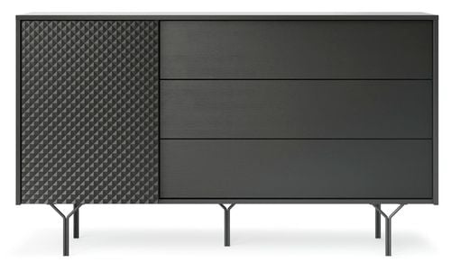Komoda Navara została wykonana z materiałów najwyższej jakości. Płyta MDF pokryta czarną półmatową okleiną, charakteryzuje się idealną gładkością i jest odporna na wilgoć, zarysowania i wysokie temperatury. Tak samo jak metalowe nogi odpowiednio zabezpieczone przed odpryskiem farby spowodowanym, np. pracą robota sprzątającego. Komoda Navara wykonana jest precyzyjnie zgodnie z najwyższymi standardami, by służyć Ci przez lata! Wszystkie elementy komody do salonu są starannie dopasowane, aby zagwarantować trwałość i bezproblemową eksploatację mebla.