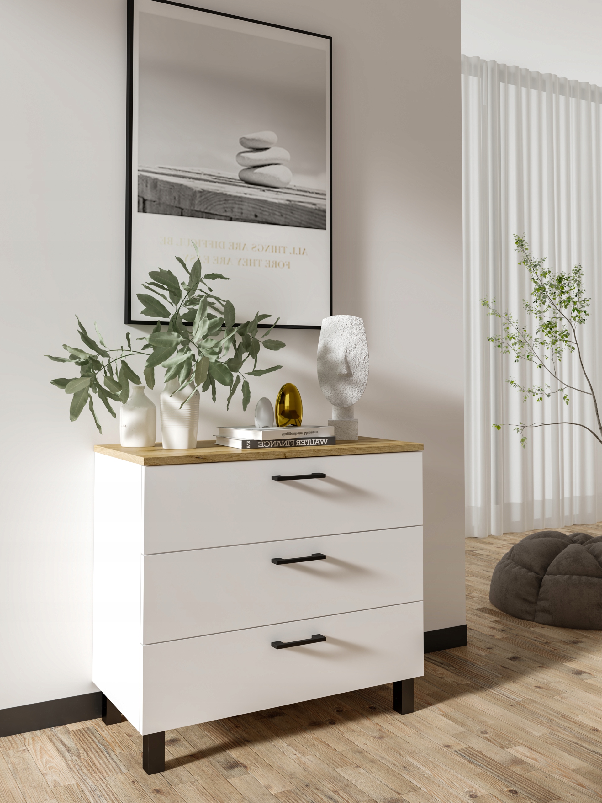 Jeśli szukasz czegoś, co doda charakteru Twojemu wnętrzu, komoda Nela 60 będzie strzałem w dziesiątkę! To idealne połączenie stylu i funkcjonalności. Jej klasyczny design w odcieniu białym z elementami dębu craft złotego wprowadzi przytulną atmosferę do każdego pomieszczenia.