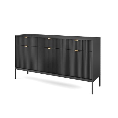 Odkryj niezwykłe zalety komody Nova, która została stworzona z myślą o you. Jej ryflowany front, osadzony na solidnych metalowych nóżkach, nie tylko przyciąga wzrok, ale także dodaje meblu lekkości i nowoczesności. Głęboki czarny kolor korpusu oraz frontu sprawia, że komoda ta doskonale wpasuje się w różnorodne aranżacje wnętrz, dodając im klasę i elegancję.