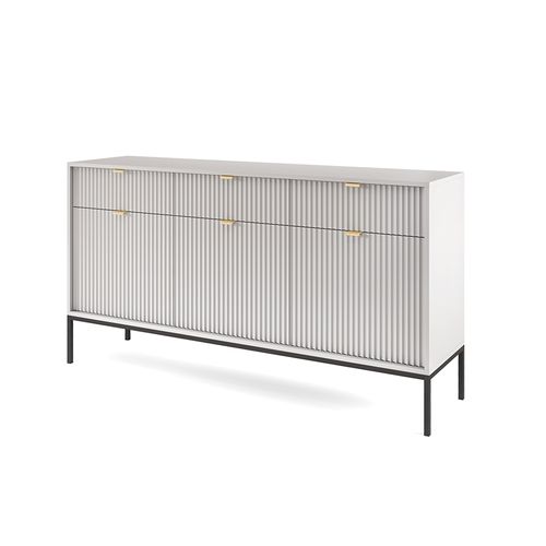 Przestronna komoda Nova to idealne wyposażenie salonu, przedpokoju, poczekalni, a nawet gabinetu. Produkt posiada prostą formę, dzięki czemu wpasuje się w większość pomieszczeń, niezależnie w jakim stylu zostały utworzone. Komoda Nova została wykonana z najwyższej jakości płyty laminowanej, która gwarantuje użytkowanie mebla na długie lata. Ozdobny front i złote uchwyty sprawiają ze produkt wygląda niezwykle elegancko. Metalowe nóżki komody stanowią stabilną podstawę.