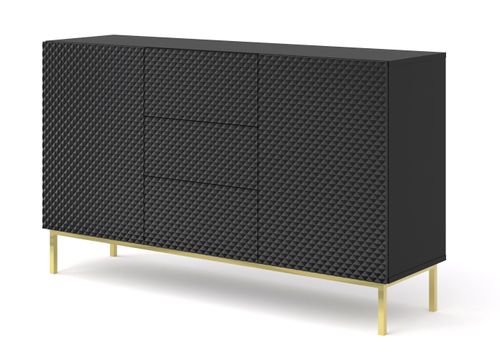 Komoda wykonana jest z płyty laminowanej o grubości 16 mm, z obrzeżem ABS 0,6 mm, co znacząco podnosi jej trwałość. Fronty z płyty MDF w czarnym połysku zapraszają do wprowadzenia odrobiny luksusu do Twojego wnętrza. Dostępna jest z elegancką metalową ramą w kolorze złotym lub czarnym – wybierz tę, która najlepiej pasuje do Twojego stylu.