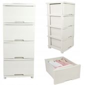 Ta wysokiej jakości komoda łazienkowa Viking w stylu rattan model ECRU charakteryzuje się nie tylko eleganckim i ponadczasowym designem w kolorze ecru, ale także wyjątkową funkcjonalnością. Posiada 4 przestronne szuflady, które idealnie organizują przestrzeń, zapewniając łatwy dostęp do kosmetyków, ręczników i akcesoriów łazienkowych, co podnosi codzienny komfort użytkowania.