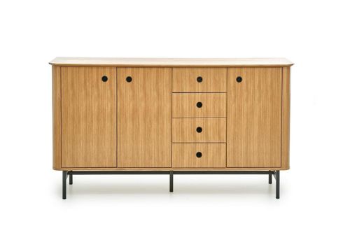 Komoda o wymiarach 167/44/93 cm to idealne oraz dla osób poszukujących funkcjonalnego i stylowego mebla do swojego wnętrza. Wykonana z wysokiej jakości materiałów, takich jak MDF z okleiną naturalną dębową, płyta meblowa z okleiną dębową lub stal malowana proszkowo, gwarantuje trwałość i solidność przez wiele lat. Dzięki swojemu klasycznemu kolorowi dąb naturalny - czarny, ta komoda doskonale wpasuje się w wnętrza w stylu kolonialnym i boho. Jej elegancki wygląd i unikalny design będą stanowić doskonałe uzupełnienie każdego pomieszczenia.
