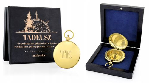 Kompas wykonany z mosiądzu, będzie nie tylko praktycznym upominkiem ale także znakomicie spełni swoje zadanie jako element wystroju wnętrza. Urządzenie stanowi świetną propozycję prezentową dla myśliwych, żeglarzy, szefa lub nauczyciela - jako kompas stanowiący alegorię podążania we właściwym kierunku. Dzięki indywidualnej, grawerowanej dedykacji, zamieszczonej na wieczku eleganckiej drewnianej szkatułki będzie to podarunek jedyny w swoim rodzaju, dodatkowo wygrawerujemy inicjały na kompasie. Wnętrze wyłożone jest welurowym materiałem w kolorze granatowym.