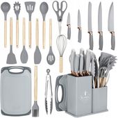 ✔️ Kompletny zestaw akcesoriów kuchennych, w tym trzepaczka, nożyczki, szcypce, pędzelek, szpatułki, łyżki i chochelka, ułatwiających codzienne przygotowywanie posiłków.