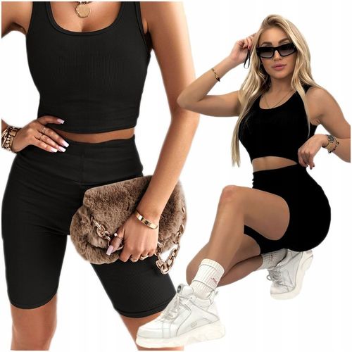 Ten dopasowany komplet damski, składający się z prążkowanego topu i kolarek, został uszyty w Polsce z najwyższej jakości materiałów. Doskonale łączy komfort z modnym wyglądem, dzięki czemu zapewnia pełną swobodę ruchów bez uszczerbku na stylu.