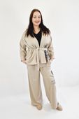 Narzutka to nie tylko wygodna, ale również stylowa część tego kompletu. Zapewnia ona swobodę ruchów i dodaje całej stylizacji lekkości i elegancji. Można ją swobodnie założyć na inne ubrania lub nosić jako samodzielny element, co czyni ją bardzo wszechstronną. Dodatkowym elementem tego kompletu jest elegancki pasek, który nadaje kształtu narzutce, dodając tym samym stylowego wykończenia. Można go dowolnie wiązać, aby podkreślić talię i dopasować wygląd kompletu do swoich preferencji.