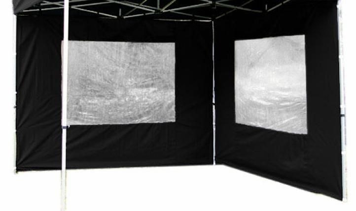 Komplet dwóch ścian do pawilonu PROFI o podstawie 3 x 3 m - czarny. Ścianki łatwe w montażu za pomocą pasków na rzepy lub haczyków. Materiał wodoszczelny oddychający - poliester PA powlekany, chroniący przed wiatrem.