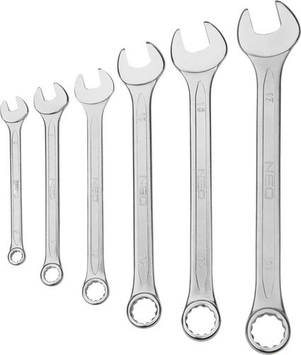 - Zestaw kluczy płasko-oczkowych zawiera klucze w popularnych rozmiarach, wykonane zgodnie z normą DIN 3113.