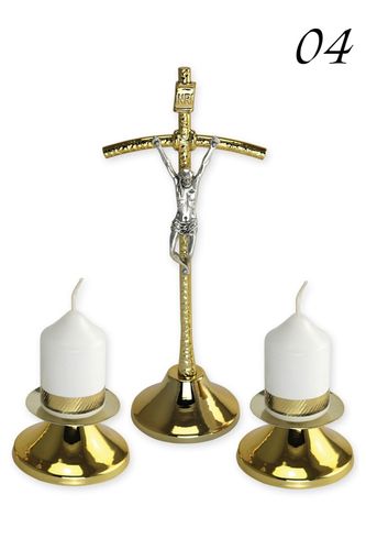 Zestaw składa się z stojącego krzyża metalowego, dwóch lichtarzy na świeczki nabijane. Dodatkowo w pudełku znajdują się dwie świece nabijane w kolorze białym.