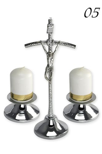 Zestaw składa się z stojącego krzyża metalowego, dwóch lichtarzy na świeczki nabijane. Dodatkowo w pudełku znajdują się dwie świece nabijane w kolorze białym.