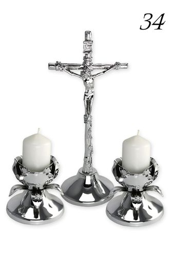 Zestaw składa się z stojącego krzyża metalowego, dwóch lichtarzy na świeczki nabijane. Dodatkowo w pudełku znajdują się dwie świece nabijane w kolorze białym.