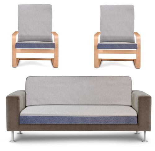 Dekoracyjny komplet narzut na kanapę i fotele jest wykonany z dwóch materiałów. Tkanina jest w kolorze szarym, natomiast lamówki są granatowe. Eleganckie narzuty dodają świeżości wnętrzu. Tak dobrana kolorystyka wpasuje się zarówno w klasyczne wnętrze jak i to w charakterze eleganckim. Będą one idealnym wyborem, jeśli oczekujemy ładnej narzuty oraz praktycznego rozwiązania.