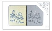 Na ręcznikach występuje tekst Mąż i Żona. Jeden ręcznik jest w kolorze kremowym, natomiast drugi jest szary. Na obu wyhaftowano również wesoły obrazek nowożeńców na rowerach.