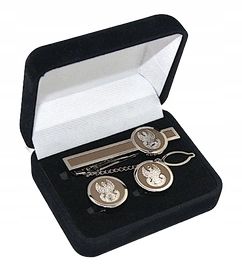 Komplet spinek jest dostarczany w stylowym, dwurzędowym etui oklejonym zamszem. Dostępne w szlachetnych kolorach szafirowym lub czarnym, etui to nie tylko praktyczne rozwiązanie do przechowywania, ale także ozdoba sama w sobie.