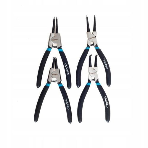 Zestaw składa się z czterech różnych szczypiec: prostych i wygiętych do pierścieni wewnętrznych oraz prostych i wygiętych do pierścieni zewnętrznych. Ta różnorodność umożliwia pracę z szeroką gamą elementów, czyniąc go niezbędnym narzędziem w warsztacie czy serwisie.