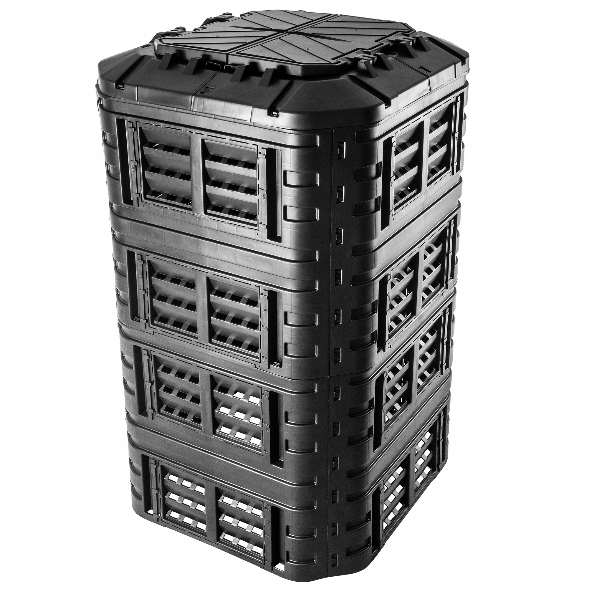 Solidny i szczelny kompostownik modularny posiada funkcjonalne udogodnienia. Geometryczna konstrukcja została wyposażona w specjalnie otwory i rynienki w ścianach bocznych, które zapewniają właściwą cyrkulację powietrza oraz nawodnienie dla masy kompostowej, wpływając na przyspieszony proces rozkładu odpadów.