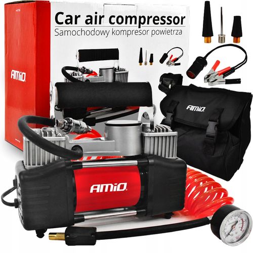 Kompresor w solidnej obudowie opartej na gumowych nóżkach, które niwelują drgania podczas jego pracy . Wyposażany w analogowy manometr, zasilany przez gniazdo zapalniczki samochodowej lub z akumulatora. Oprócz standardowej końcówki samochodowej do zestawu dołączono również trzy końcówki do wentyli (dwie stożkowe i jedna igłowa).