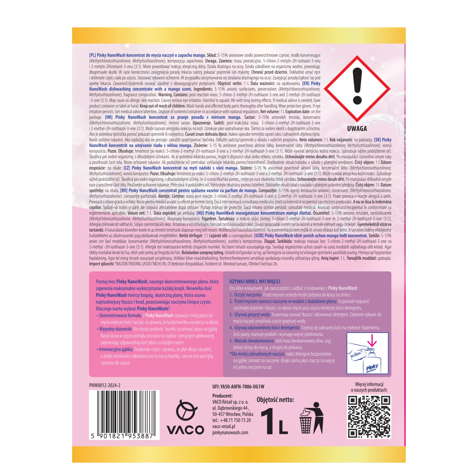 Koncentrat Pinky NanoWash Mango to wysoko skoncentrowany płyn do mycia naczyń, który zapewnia maksymalną wydajność. Każda kropla tworzy intensywną pianę, skutecznie rozpuszczając tłuszcz i brud, co sprawia, że płyn wystarcza na dłużej.