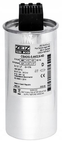 Ten kondensator do kompensacji mocy biernej CSADG-0,44/2,5-HD wyróżnia się precyzyjną konstrukcją i niezawodnymi parametrami, zapewniającymi stabilne napięcie 440 V oraz prąd znamionowy 3,28 A. Z mocą znamionową 2,5 kVar i pojemnością 3 x 13,7 μF, idealnie wspiera efektywne zarządzanie energią w systemach trójfazowych, minimalizując straty i gwarantując długoterminową wydajność.