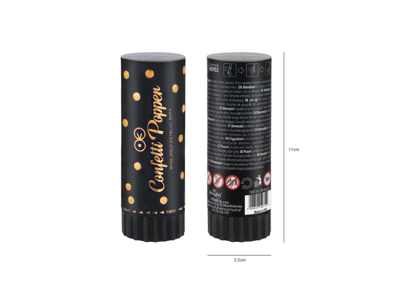 Nasza tuba z konfetti o wysokości 11 cm została stworzona z wysokiej jakości kartonu i wykorzystuje sprężone powietrze, aby z bezpiecznym i efektownym hukiem unieść złote kółka w powietrze. Dzięki temu, że produkt nie zawiera żadnych ładunków wybuchowych, możesz cieszyć się tą radosną chwilą z pełnym spokojem. Pamiętaj jednak, że produkt nie jest przeznaczony dla dzieci, więc zachowaj ostrożność podczas użycia.