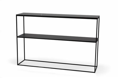 Bazę konsoli stanowi metalowa konstrukcja lakierowana na biało. Na niej opiera się podłużny, prostokątny blat z płyty MDF pokrytej laminatem HPL o wzorze ciemnoszarego marmuru.