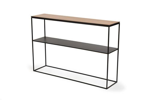 Bazę konsoli stanowi metalowa konstrukcja lakierowana na czarno. Na niej opiera się podłużny, prostokątny blat z płyty MDF pokrytej naturalnym fornirem w kolorze dębu. Jego powierzchnia została polakierowana, aby zapewnić dodatkową ochronę.