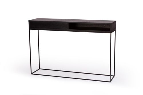 Korpus i fronty konsoli wykonane zostały z płyty wiórowej 18 mm. STAM posiada jedną szufladę zakrytą i jedną półkę odkrytą, na której można położyć swoje ulubione książki. Szuflada otwiera się na kliknięcie. Dzięki takiemu rozwiązaniu mebel zyskuje na elegancji. Na blacie konsoli pięknie będą się prezentowały kwiaty w wazonie, obraz czy książki. Ciekawym elementem są metalowe nogi proszkowane na czarno, które zapewniają całej konstrukcji stabilność. Mebel wymaga samodzielnego montażu.