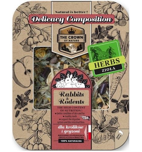 KORONA NATURY Delicja Ziołowa to smaczny, w pełni naturalny przysmak dla gryzoni i królików, który przenosi Twojego pupila na pachnącą wiosenną łąkę. Aromatyczne zioła, trawy i owoce dostarczają błonnika oraz cennych składników odżywczych, wspierając prawidłowe funkcjonowanie układu pokarmowego i ogólne zdrowie. Zróżnicowana kompozycja roślin i owoców stymuluje ciekawość, aktywność i naturalne zachowania eksploracyjne, zapewniając jednocześnie pyszną przekąskę między posiłkami. Produkt jest w 100% naturalny, bez sztucznych konserwantów, co czyni go bezpiecznym i zdrowym dodatkiem do codziennej diety Twojego gryzonia lub królika.