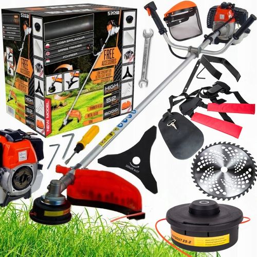 ✔️ **Ergonomiczny design z redukcją wibracji**: Oburęczny uchwyt z blokadą przepustnicy i wygodne szelki pozwalają na stabilną pracę na zboczach czy w zaroślach, z łatwą wymianą akcesoriów jak żyłka 1,6-3 mm.