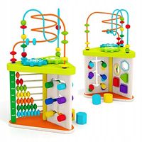 Drewniana kostka edukacyjna jest doskonałą zabawką do ćwiczenia koordynacji wzrokowo- ruchowej Twojego dziecka. Na każdej ścianie Twoje dziecko znajdzie inną zabawę; elementy do przesuwania, labirynt, liczydło, dopasowywanie kształtów, zębatki.