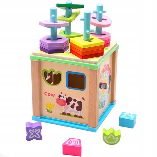Drewniana kostka edukacyjna jest doskonałą zabawką do ćwiczenia koordynacji wzrokowo- ruchowej Twojego dziecka. Na każdej ścianie Twoje dziecko znajdzie inną zabawę; elementy do przesuwania, obrotowe klocki z obrazkiem do ułożenia oraz zegar.
