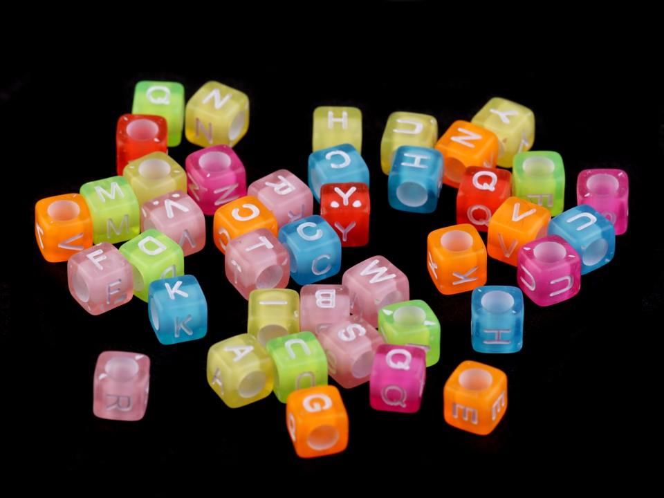 Koraliki z literkami zachwycą przede wszystkim dzieci w wieku szkolnym. Można tworzyć z nich popularne bransoletki przyjaźni z imieniem obdarowanego. Koraliki mają kształt kostki. Horyzontalnie umieszczony otwór do przewlekania umożliwia tworzenie z liter słów, imion itp. Koralik ma biały kolor, literki są w różnych kolorach. W woreczku znajduje się mix różnych liter. Woreczek nie musi zawierać wszystkich liter alfabetu, pojedyncze opakowania mogą różnić się od siebie. Literki są z alfabetu angielskiego, nie zawierają znaków diakrytycznych.