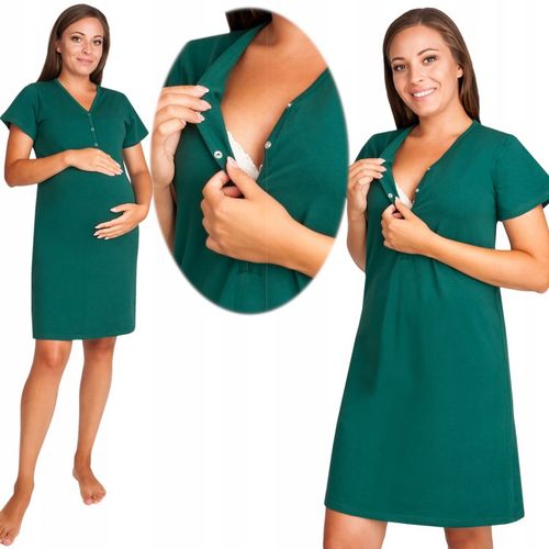 Ta wysokiej jakości koszula nocna ciążowa ABIGAIL w zielonym kolorze, model do karmienia piersią, wyróżnia się prostym, klasycznym wzorem, który zapewnia wygodę na co dzień. Z dekoltem w szpic rozpinanym na springi-napy, umożliwia szybki i dyskretny dostęp do piersi, idealny do nocnych karmień czy pobytu w szpitalu, gwarantując pełen relaks i swobodę ruchów.