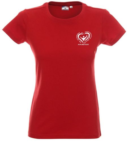 Koszulka damska czerwona Haretski wysoka jakość. Optymalna gramatura, taliowany krój, podkreślający sylwetkę. Waga: 170 g/m2 Skład: 100% bawełna