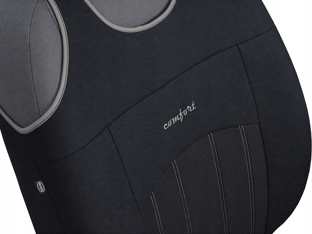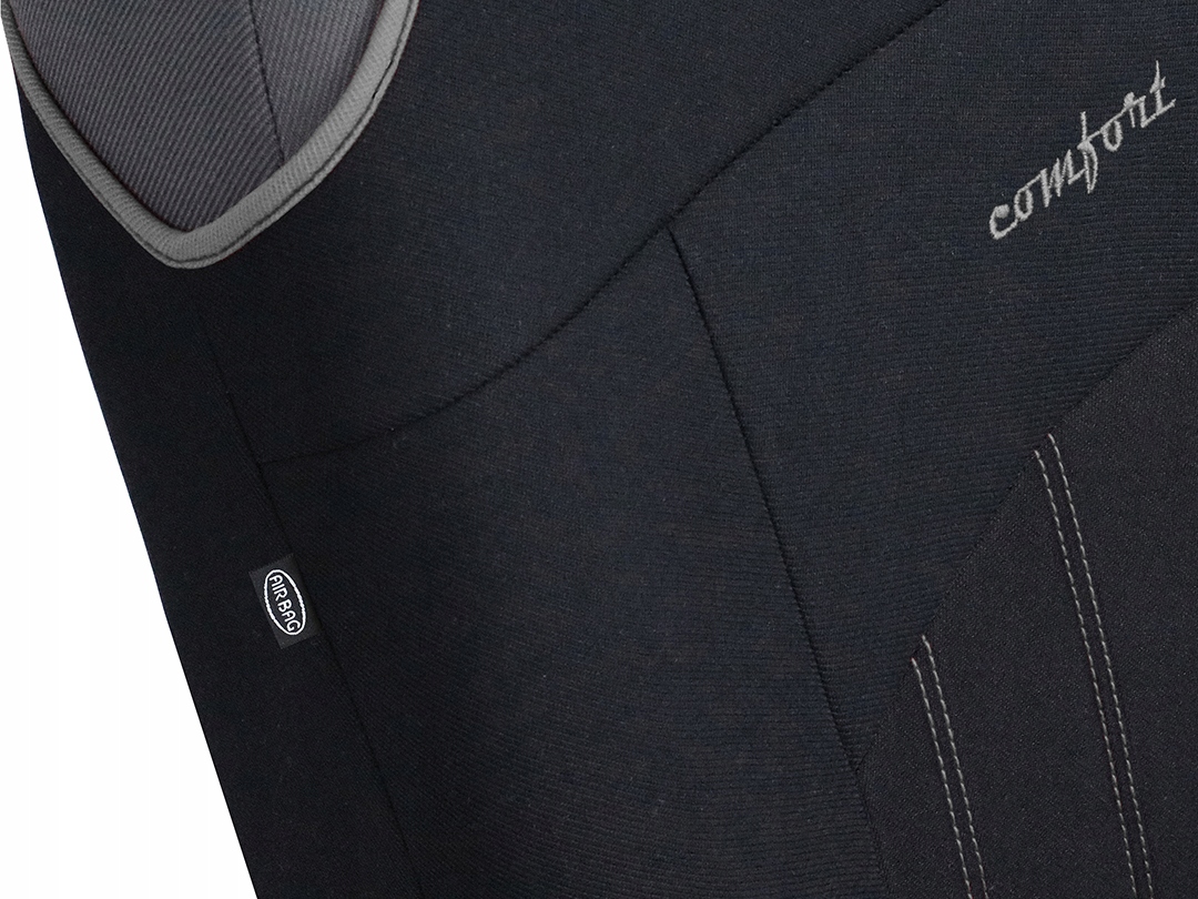 Oferowane koszulki serii COMFORT są polskim produktem wykonanym z wysokiej jakości dzianiny tapicerskiej (w kolorze czarnym) wzbogaconym o dodatkowe przeszycia nadające im oryginalny wygląd. Na oparciu napis "comfort" wykonany techniką haftu komputerowego. Zdjęcia i zbliżenia (poglądowe) przedstawiające wzory i materiały dostępne w ofercie.