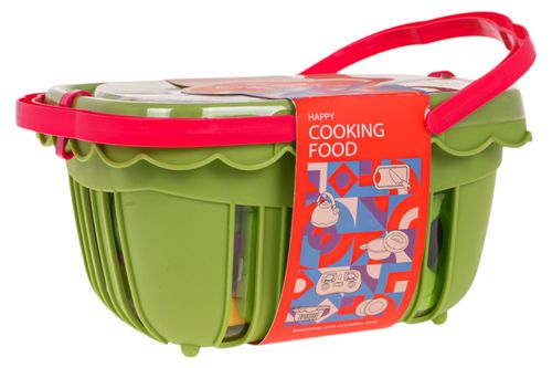 | Koszyk z akcesoriami dla dzieci od 3-go roku życia. W zestawie znajduje się koszyk piknikowy, garnek z pokrywką, deska do krojenia warzyw i owoców, nóż, patelnia, talerzyki, kubki oraz atrapy warzyw i owoców na rzepy. Idealny sposób na zabawę na zewnątrz.
