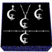 Komplet biżuterii "Kotek na księżycu", jest wykonany w 100% ze srebra próby 925. Oferuje nie tylko subtelny i elegancki wygląd, ale i praktyczne opcje nośne. Zestaw obejmuje naszyjnik, kolczyki na sztyftach i bransoletkę, wszystko ozdobione efektowną zawieszką, która dodaje uroku i unikalności.