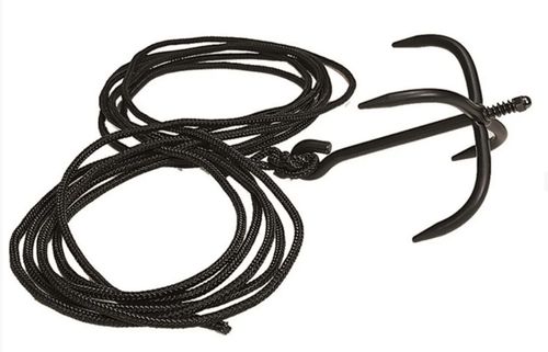 Stabilny hak 4 punktowy, skręcany z 3 elementów. Kotwiczka wykonana jest z czernionego żelaza, linę wykonano z nylonu.