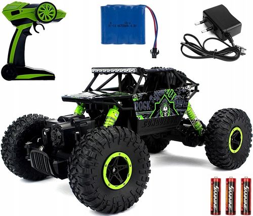 Ten wyjątkowy samochód RC Rock Crawler w skali 1:18 wyposażony jest w napęd na wszystkie cztery koła z dwoma niezależnymi silnikami. Specjalne zawieszenie i duże koła z miękkiej gumy zapewniają doskonałą przyczepność na każdej powierzchni - od asfaltu, przez kamienie, aż po leśną ściółkę i błoto.