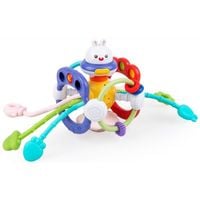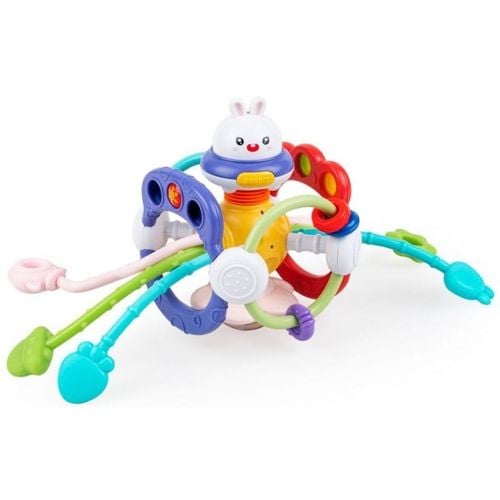 Zabawka pełna sensorycznych atrakcji, które nie tylko zabawią maluszka, ale dostarczą mu też okazji do rozwijania zdolności poznawczych. Znajdujący się na górze zabawki króliczek uroczo piszczy przy naciskaniu. Znajdziemy tu też linki do przeciągania, różniące się kolorem, kształtem i fakturą, ruchome koraliki, terkocący kwiatek - grzechotkę, kuleczkę do przesuwania oraz trzy kuleczki pop it do wciskania. Wszystkie te precyzyjne czynności pomogą bobasowi ćwiczyć motorykę małą i odkrywać zależności przyczynowo - skutkowe.