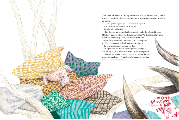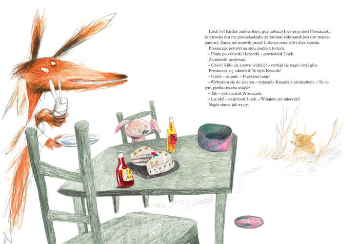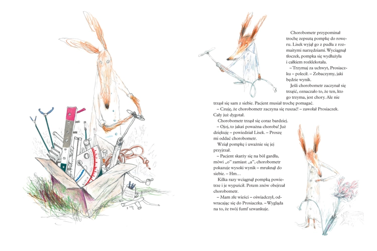 Prosiaczek trochę kaszle i postanawia wybrać się do lekarza. Jego przyjaciel, Lisek za pomocą chorobometru stawia diagnozę, która nie bardzo podoba się pacjentowi. Nie ma mowy, nie zamierza ani poddawać się operacji wycięcia fumfa, ani łykać żadnych niesmacznych lekarstw. Gdy się choruje, powinno się przecież dostawać coś na pociechę, np. pyszną oranżadę, którą krowa częstuje tylko w soboty. Albo kokosanki! Tylko czy zwykły kaszel wystarczy? A może potrzebne jest coś poważniejszego? Czy tajemnicza kropkoza pomoże Prosiaczkowi z niezakręconym ogonkiem zrealizować podejrzaną receptę? I co zrobi Lisek, gdy okaże się, że nagle przybywa mu pacjentów? W końcu każdy chciałby pić litry oranżady i jeść tort marcepanowy! Kolejna – po Kawiarence pod Ptasim Ogonem, Leśnej gazecie i Biegu z zagadkami – książka z norweskiej serii o Lisku i Prosiaku z niezakręconym ogonkiem. Niezwykłe i pełne łobuzerskiego humoru historie napisane przez Bjorna F. Rorvika współgrają ze śmiesznymi i szalonymi ilustracjami Pera Dybviga. Poznajcie Liska i Prosiaczka z niezakręconym ogonkiem! Bjørn F. Rørvik – jeden z najbardziej uznanych i najchętniej czytanych w Norwegii autorów literatury dziecięcej, wielokrotnie nagradzany za historie zabarwione zwariowanym humorem i pełne nadzwyczaj oryginalnych pomysłów, wspaniałe do czytania na głos i po cichu przez czytelników w każdym wieku. Per Dybvig – malarz, grafik, autor animacji oraz jeden z najwyżej cenionych norweskich ilustratorów literatury dziecięcej. Artysta nagradzany i wystawiany. Jego ilustracje pełne są humoru i rzadkiej, niemal dziecięcej siły wyrazu. Iwona Zimnicka – od lat tłumaczy literaturę duńską i norweską. Przełożyła pokaźną liczbę tytułów, od serii kryminałów Jo Nesbo po osławioną Moją walkę Karla Ove Knausgarda. W 1996 roku zdobyła Nagrodę im. Janusza Korczaka polskiej sekcji IBBY za tłumaczenie Przepowiedni Dżokera Josteina Gaardera oraz otrzymała Royal Norwegian Order of Merit, przyznany przez króla.