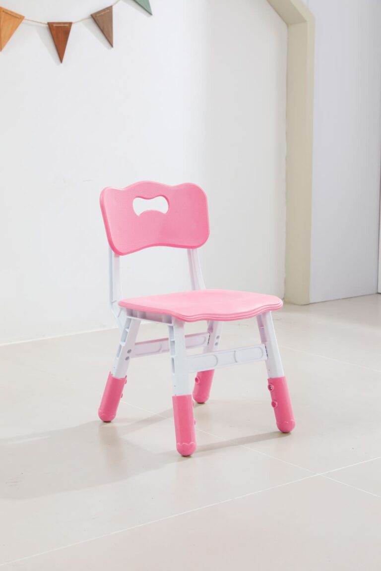 Krzesło posiada regulowaną wysokość, co pozwala na dostosowanie go do wzrostu dziecka, zapewniając ergonomiczne wsparcie podczas siedzenia. Wyprofilowane oparcie i szerokie siedzisko zwiększają komfort użytkowania, a zaokrąglone krawędzie dbają o bezpieczeństwo dziecka.