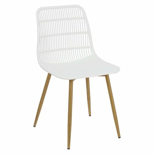 Oparcie krzesła posiada wyjątkowe, dekoracyjne otwory, które nie tylko przyciągają wzrok, ale również zapewniają doskonałą wentylację, co czyni je jeszcze bardziej przyjaznym dla użytkownika. Stabilna konstrukcja opiera się na 4 metalowych nogach, które zostały wykończone w imitacji drewna, co dodaje całości naturalnego uroku. Zakończenie nóg podkładkami w kolorze czarnym zapewnia białemu krzesłu Klaus stabilność i zapobiega przesuwaniu się podczas siedzenia.